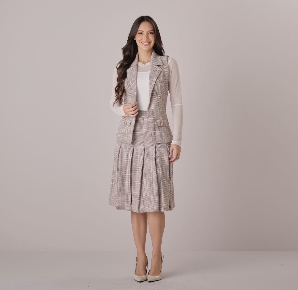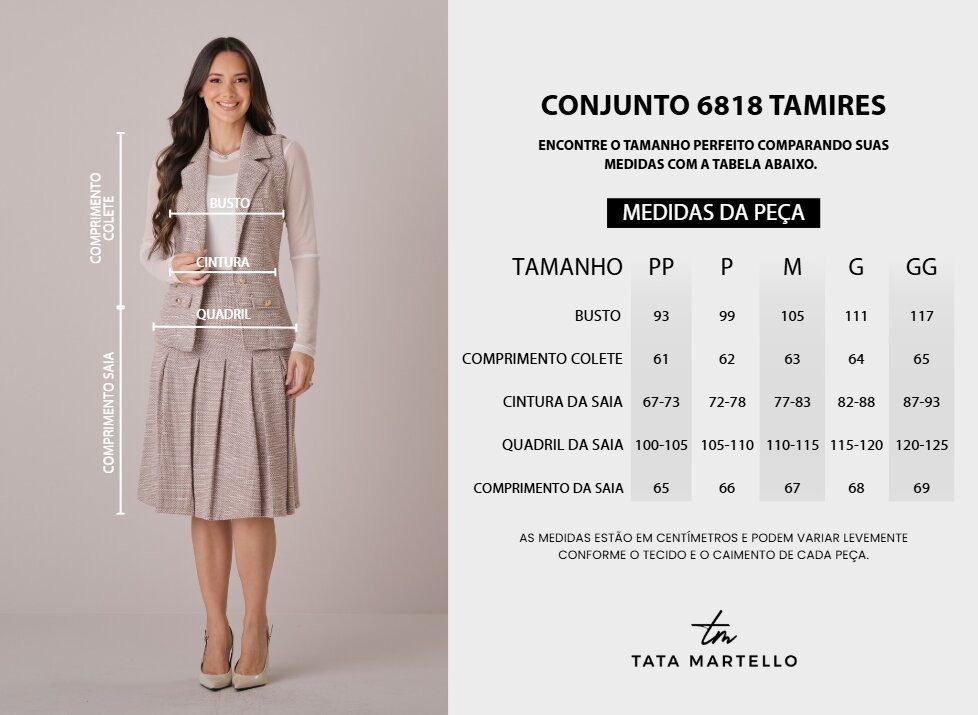 O Conjunto Tamires une estrutura, aquecimento e sofisticação em uma proposta refinada e atemporal. Em tweed encorpado e com acabamento bem construído, é ideal para dias mais frios, mantendo o visual alinhado e elegante.
