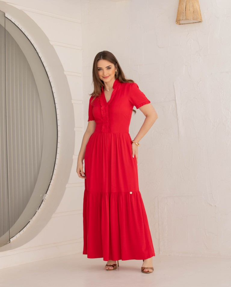 ar refinadl. Possui mangas curtas, saia com uma maria e forro. Os bolsos laterais