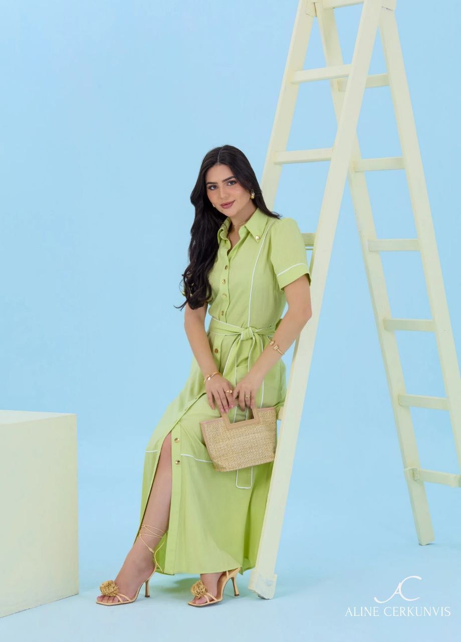 Vestido Chemise confeccionado no viscolinho, cor verde, gola de camisa com vista funcional e botões de metal dourado, manga bufante com meia lua, bolsos faca funcionais, detalhes de vivo na cor off.