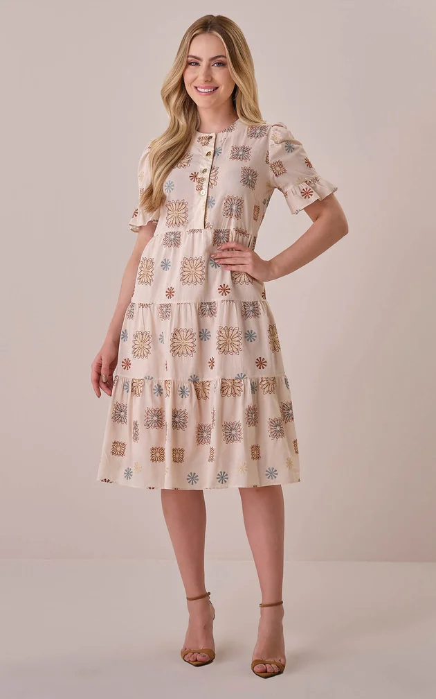 Este vestido traduz o romantismo moderno em uma proposta leve e confortável. A textura do bordado, combinada à modelagem fluida e ao acabamento com babados, cria um visual feminino e descontraído, perfeito para os dias mais leves. Os botões funcionais no busto adicionam charme e praticidade ao vestir, enquanto o forro separado proporciona conforto e segurança.