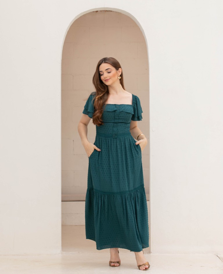 Vestido em viscose plumetis com textura de pipoquinha. Possui decote quadrado,
