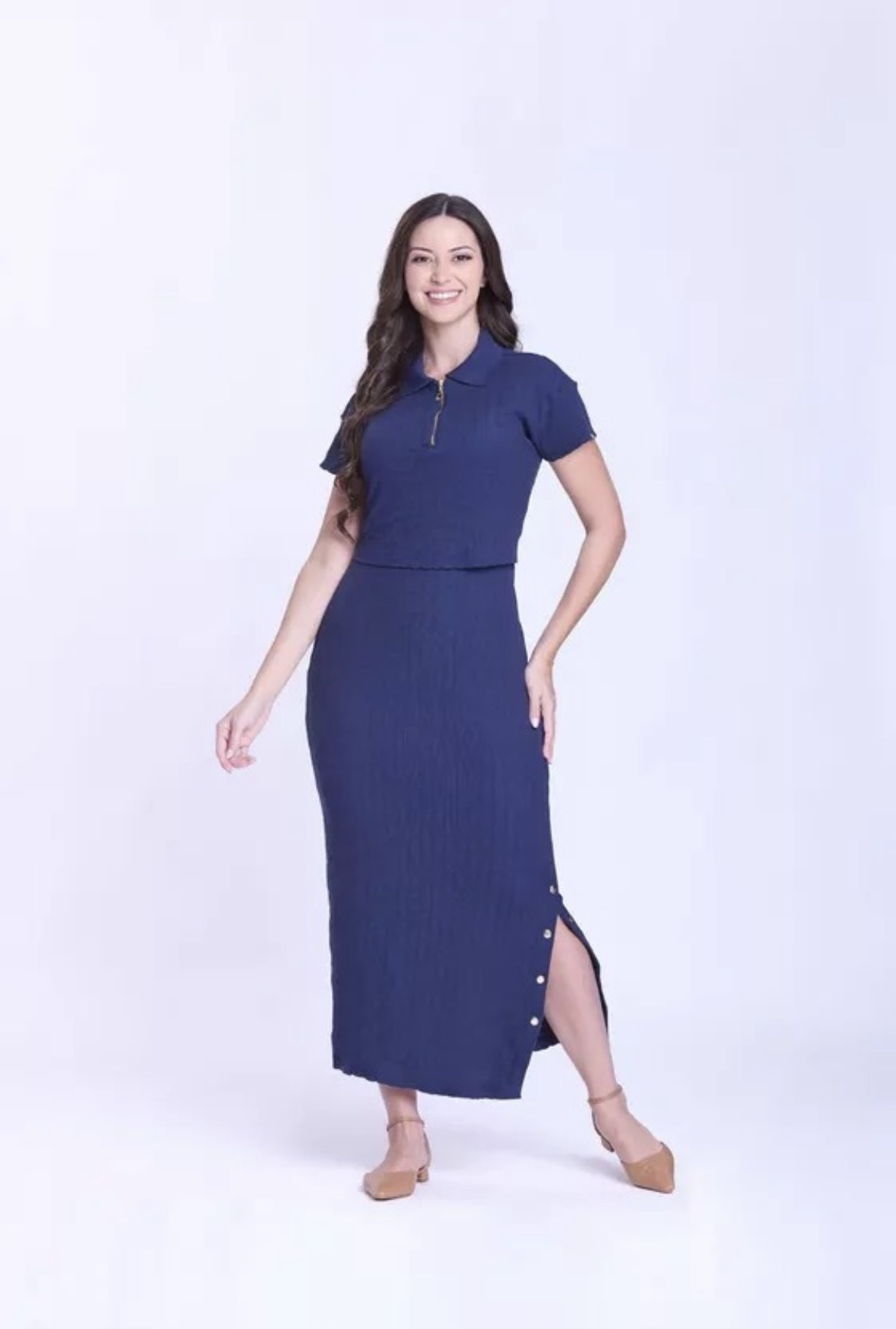 O vestido Fátima foi confeccionado em malha canelada. O modelo apresenta decote com gola, fechamento por zíper de metal com pingente, exibe uma blusa sobreposta, as mangas são curtas, lateral da saia com detalhe em botões de pressão, o shape é justo e possui forro. Esse vestido possui uma ótima vestibilidade, sendo ideal para você que ama conforto.