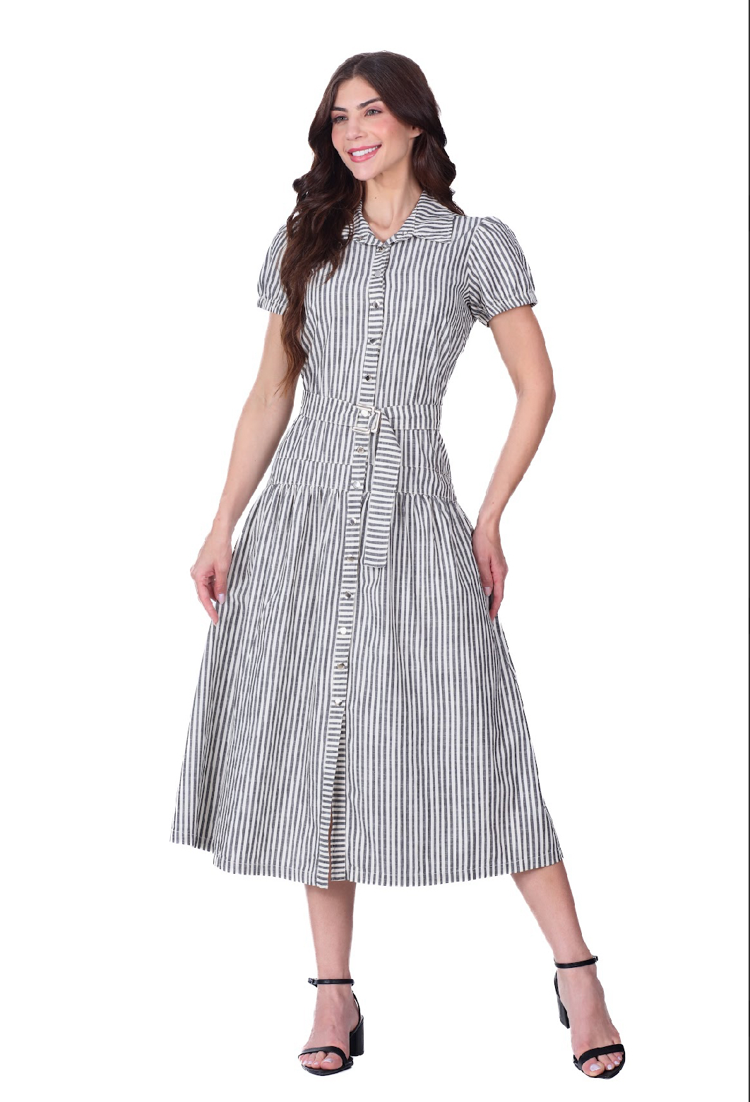 O vestido Catheleia foi confeccionado em jeans listrado. Esse modelo apresenta decote com gola, fechamento frontal por botão pressão, suas mangas são curtas com elástico interno na barra, acompanha faixa com fivela e o shape é soltinho. O look é perfeito para você que ama conforto e uma ótima vestibilidade.