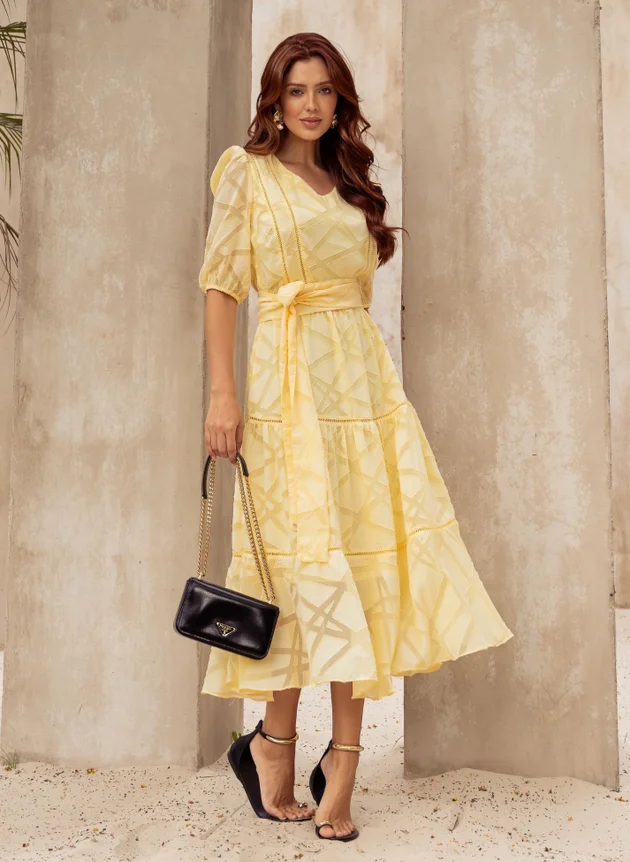Vestido Julia confeccionado em tecido Chifom Geométrico texturizado é um tecido leve e delicado, na cor amarelo com decote V possui detalhes verticais com aplique em ponto palito, corpo da peça todo forrado trazendo conforto e segurança ao uso, sua manga é mais alongada com uma velada transparência e acabamento em elástico no punho. Vestido com cintura marcada em elástico acompanha faixa para amarração, de comprimento Maxi Midi e toda forrada a saia evasê possui três Marias trazendo um caimento impecável ao look, é uma peça delicada que vem ganhando espaço nessa temporada, uma aposta sem erro. Para o bom uso da peça não usar alvejante.