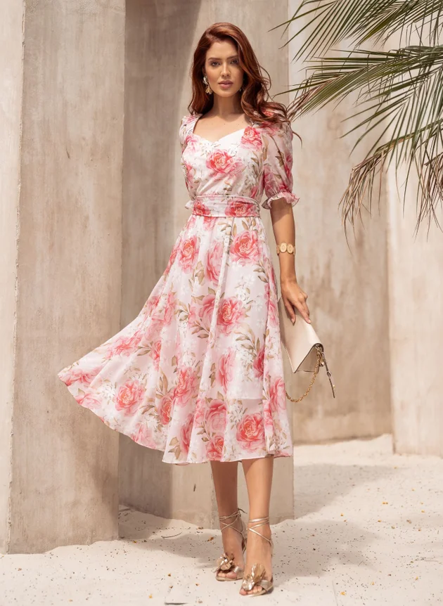 Vestido Vitoria na cor rosa confeccionado em Toque de seda e chiffon de seda dois tecidos leves e fluidos perfeitos para a proposta do look, com decote em v transpassado valorizando o colo feminino. Com dois elásticos nas laterais dos ombros trazendo sustentação para o modelo que é todo forrado no corpo em toque de seda possibilitando mais conforto ao uso, corpo da peça costurado em recortes se encaixa perfeitamente com abertura em zíper comum na lateral, sua cintura marcada acompanha faixa larga para amarrações. De comprimento midi com uma saia evasê cheia de leveza e movimento também é toda forrada com toque de seda e estampada em tecido de chiffon, sua manga mais alongada também em chiffon um tecido com uma velada transparência trazendo um charme extra ao modelo, com franzido na altura dos ombros e acabamento em elástico com pequeno babado. Uma peça extremamente confortável e romântica, com leveza e fluidez para os dias mais quentes. Atemporal pode ser usada em diversas ocasiões sejam elas mais casuais ou mais formais, para eventos diurnos ou noturnos basta usar a criatividade para compor sapatos e acessórios deixando com sua personalidade. Para maior durabilidade da peça, evite o uso de alvejantes.